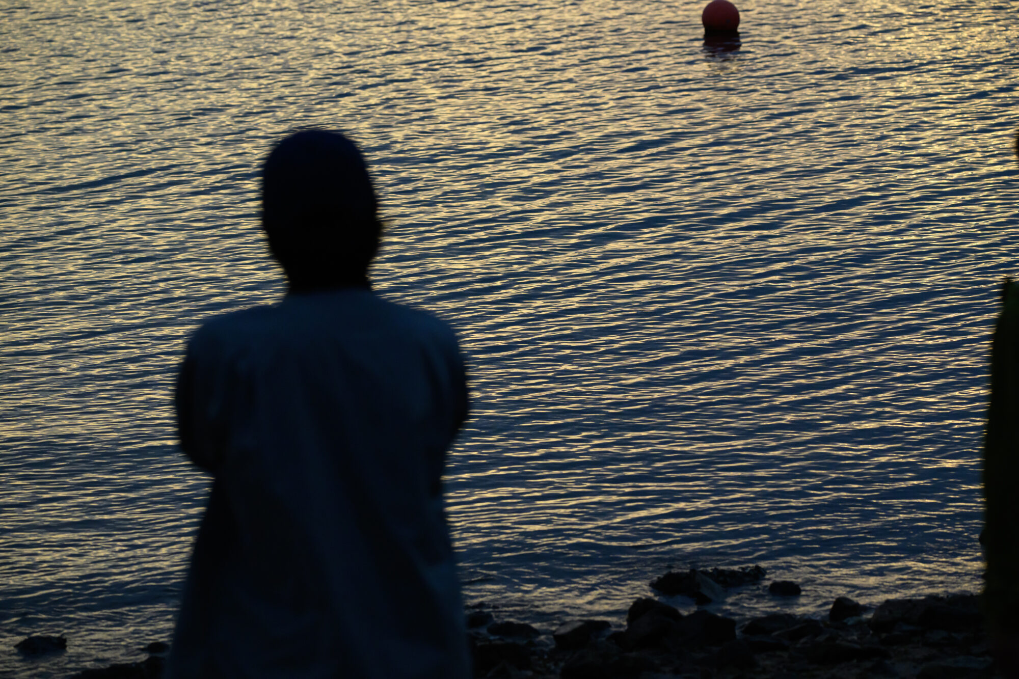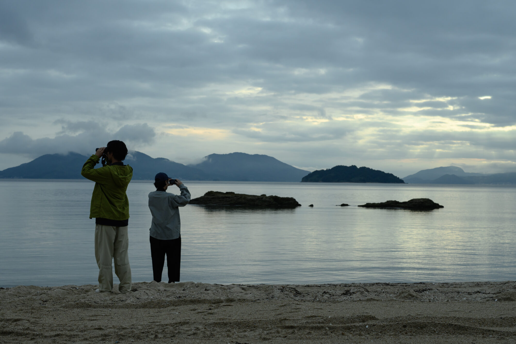 夕暮れの海辺で、じっと双眼鏡を覗き込んで