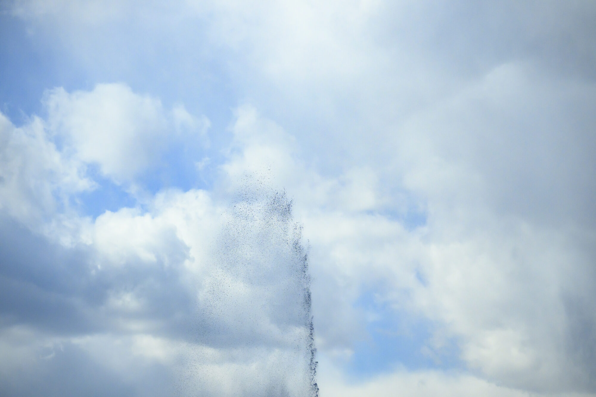 春の日差しがかげりはじめる頃になると、風がいっそう強くなってきました。『嵐の中の母子像』のすぐ後ろにある『祈りの泉』の噴水が大きくたなびき、水しぶきを輝かせています。