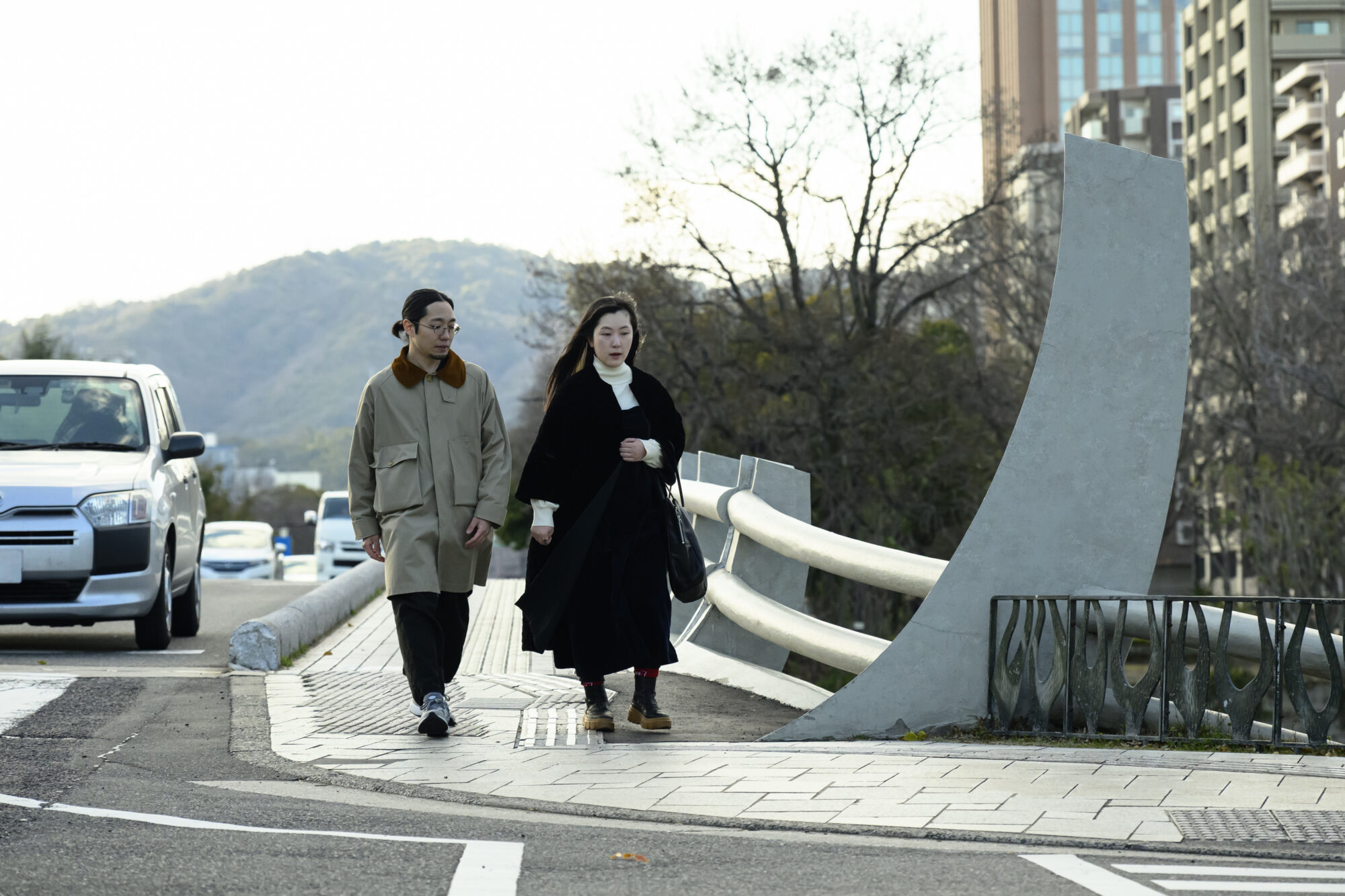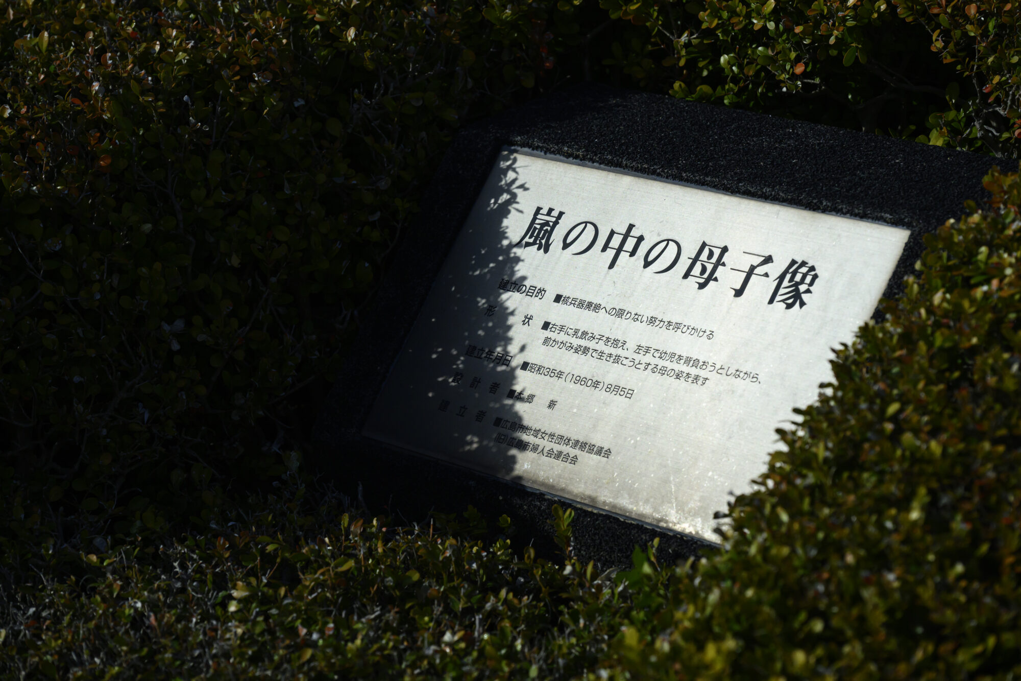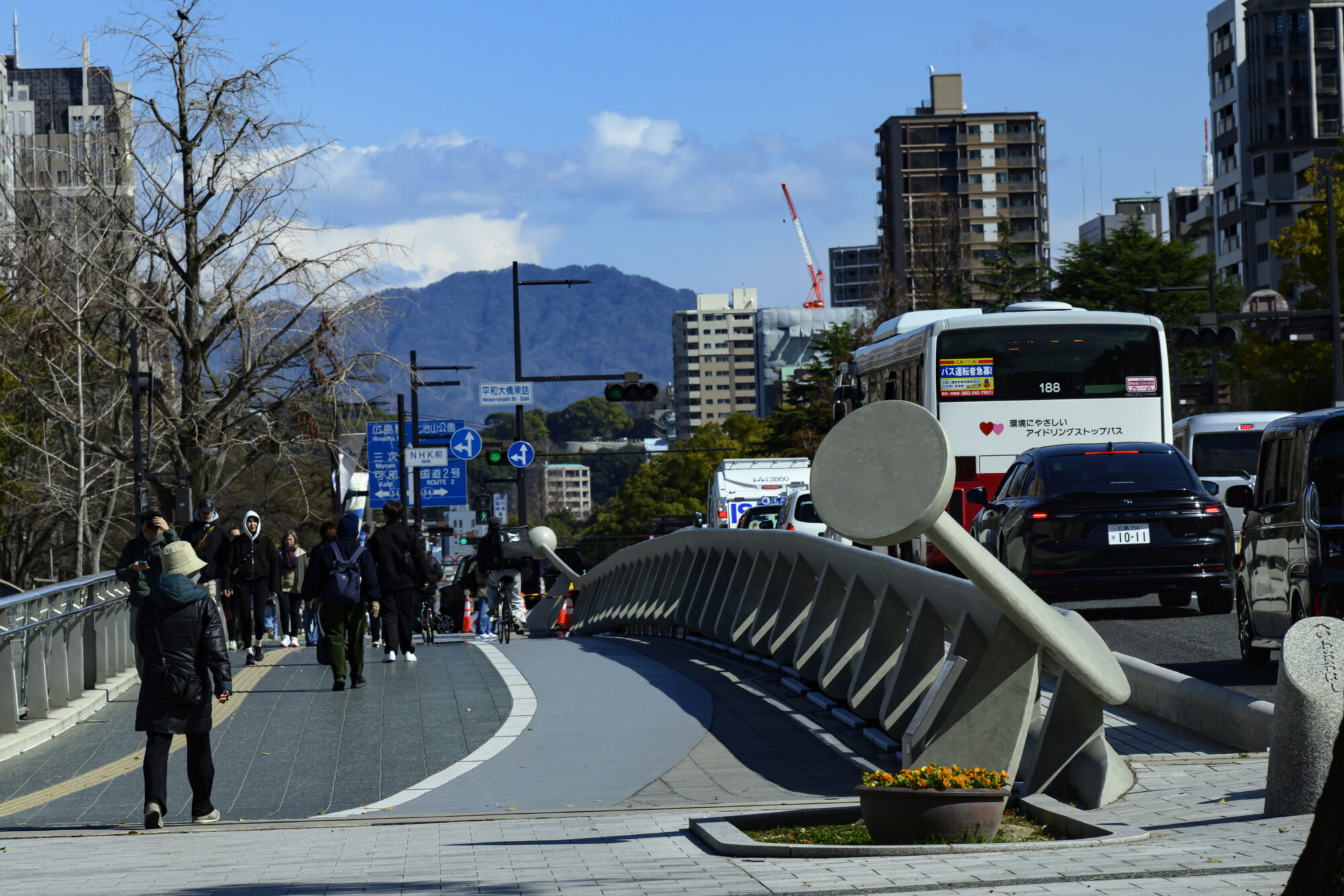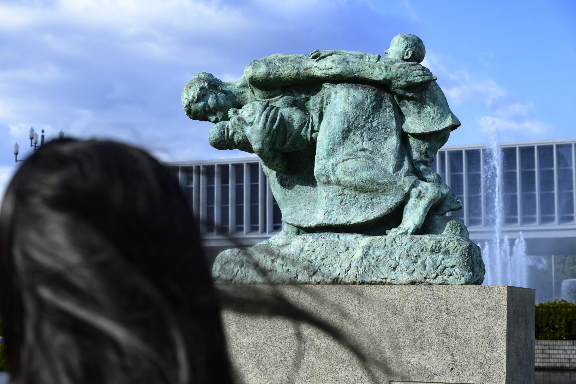 橋の上を歩きながら、あれこれ議論をするおふたり。気がつけば、次の目的地である平和記念公園を通り過ぎて、西平和大橋を渡りきっていました。けれども急ぐ旅ではありません。来た道をゆっくりと引き返していくと、平和大通りに面した『嵐の中の母子像』が見えてきました。