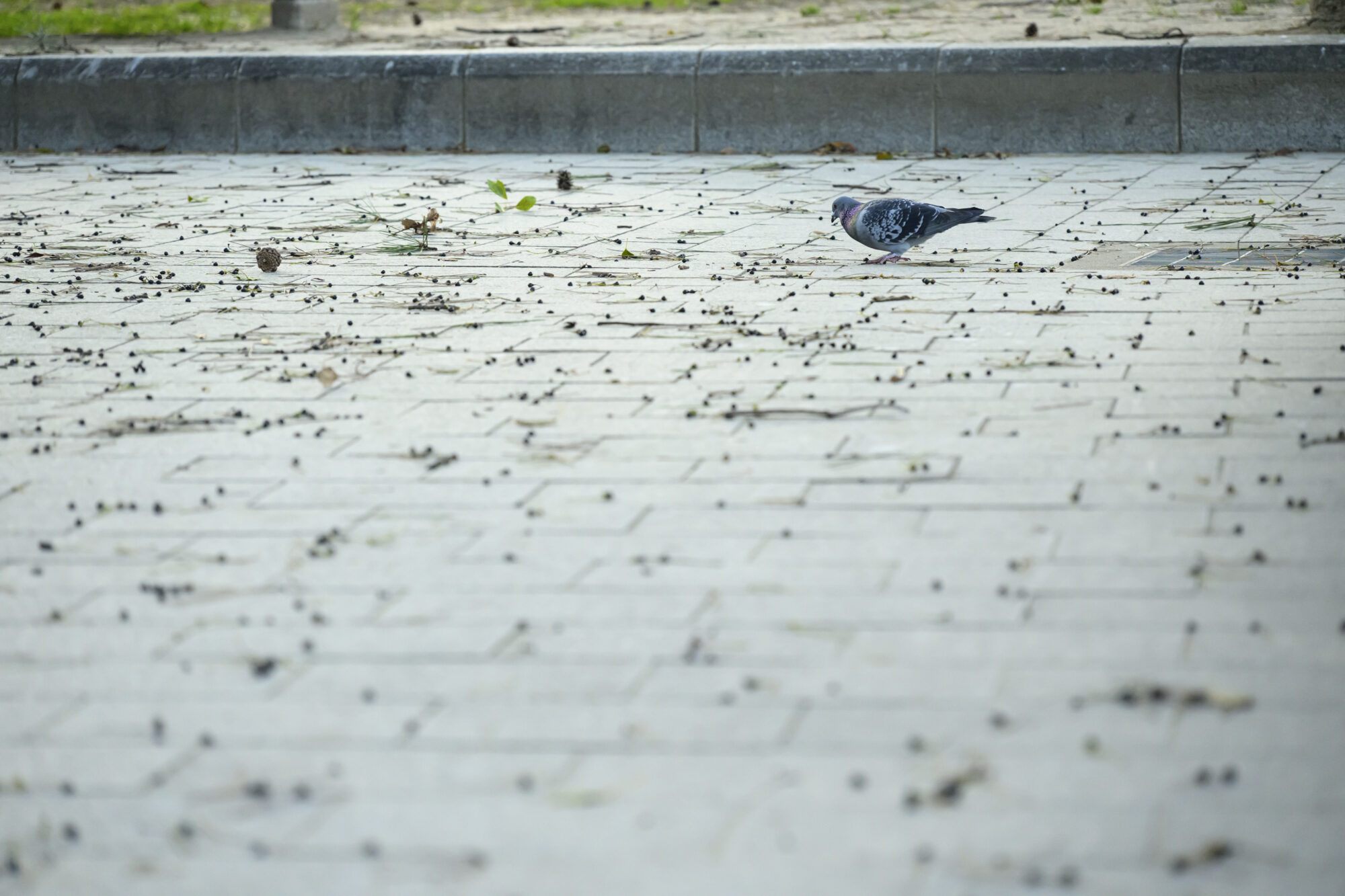 慰霊碑にかけられている千羽鶴を、風が飛ばしました。それを拾い上げる鈴木さん。向こうからは『平和の鐘』の音が聞こえています。西日の差し込む木立のなかを抜けると、『原爆の子の像』が見えてきました。