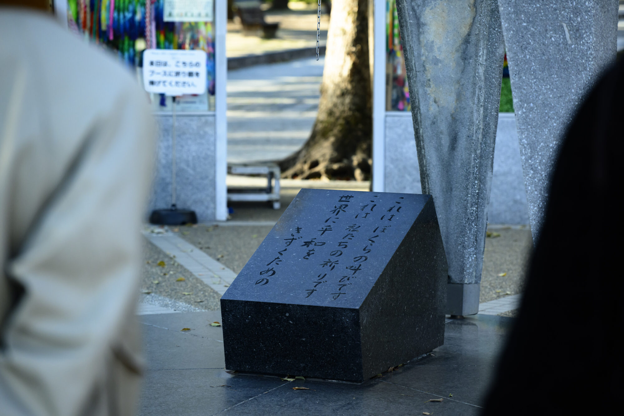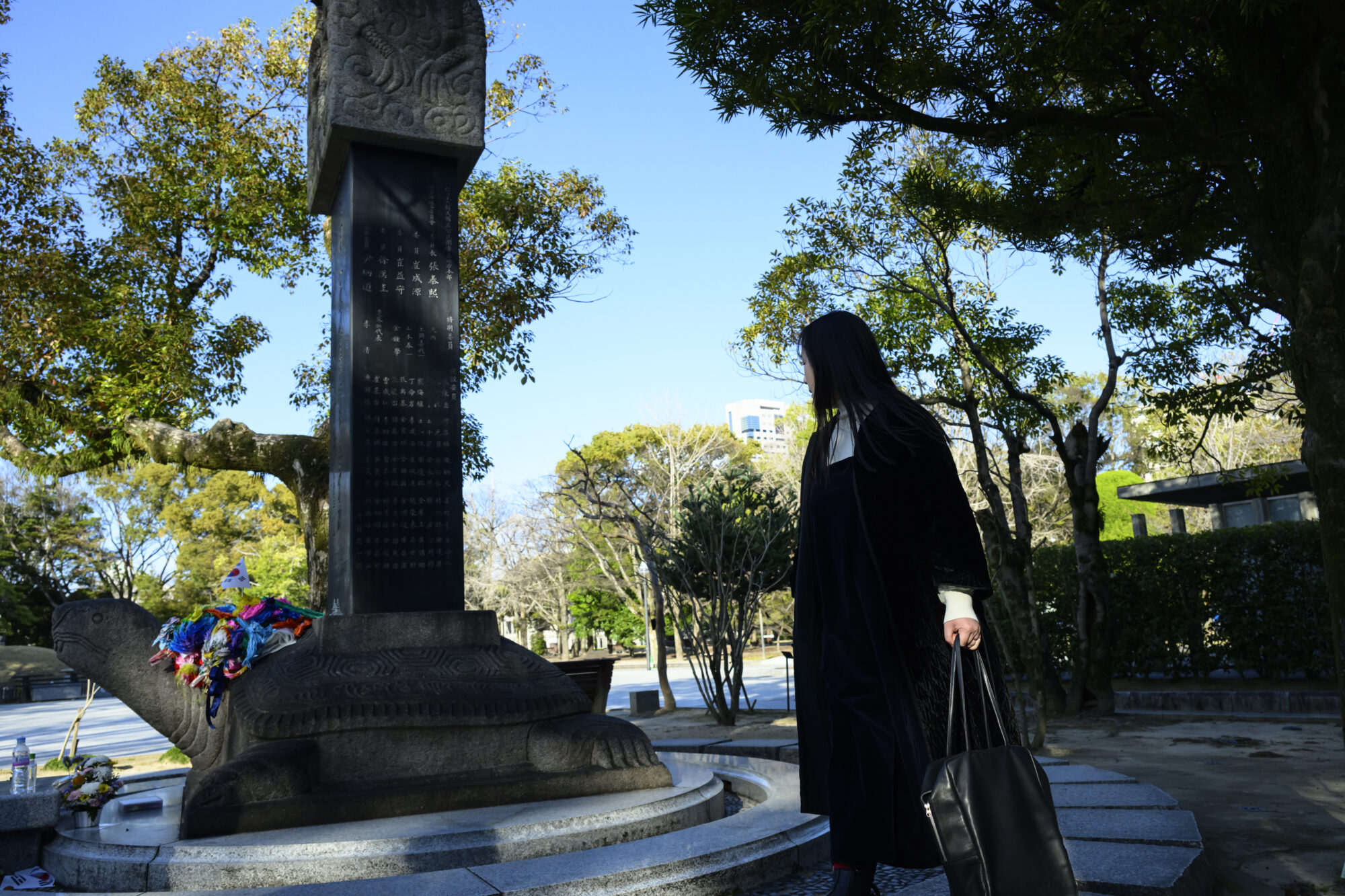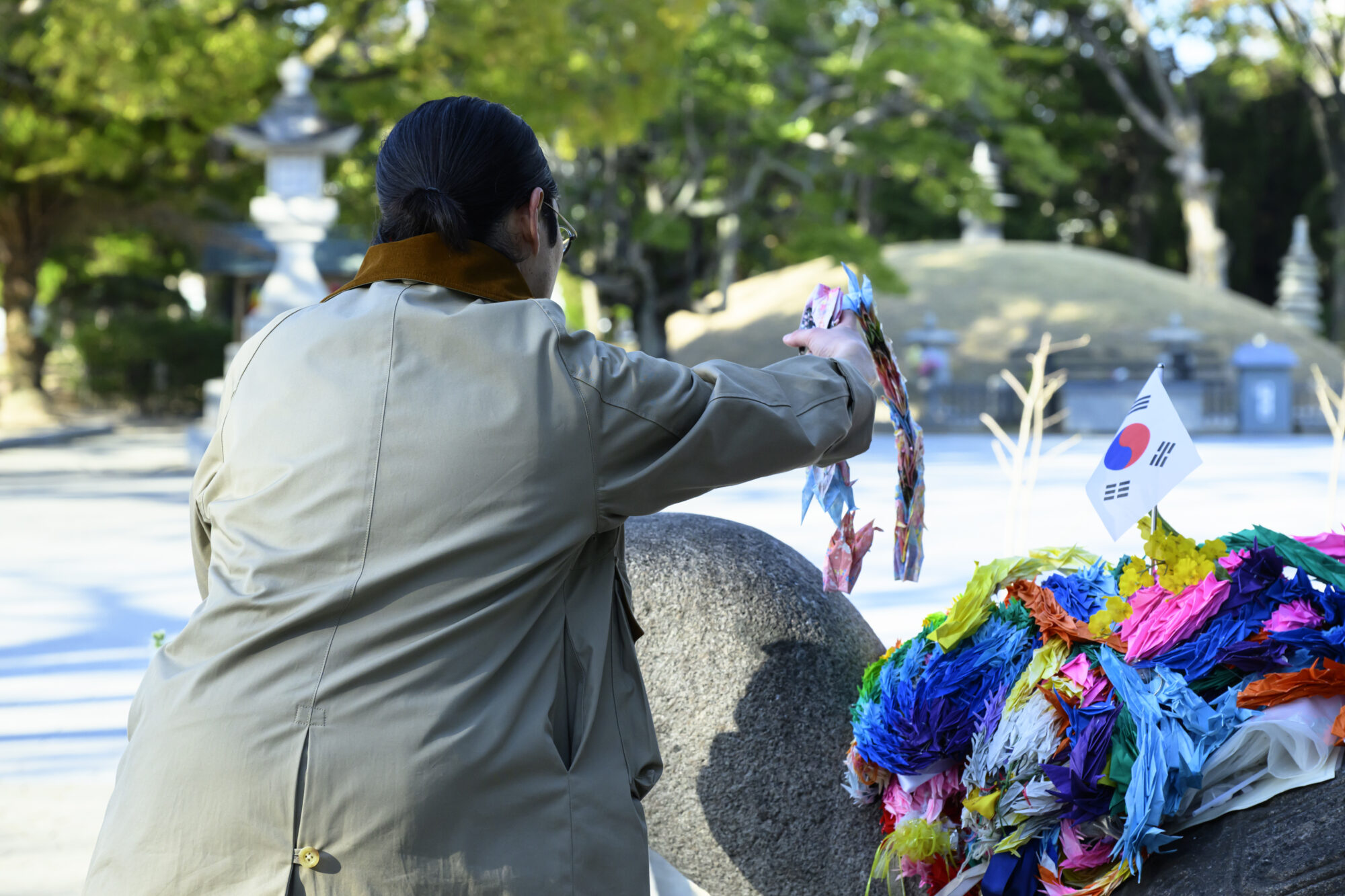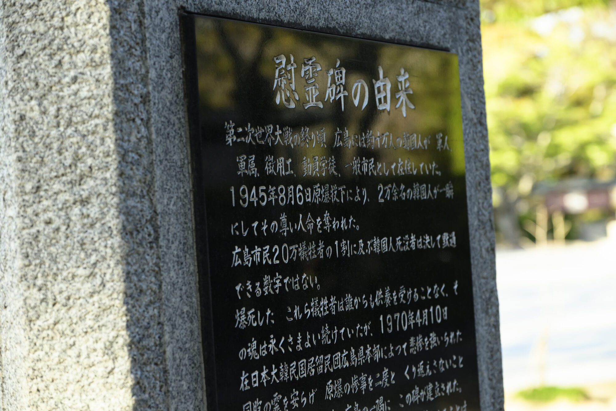 その下をくぐるようにして、おふたりは平和記念公園へ。公園の西側に広がる木立のなかを進んでいくと、『韓国人原爆犠牲者慰霊碑』が見えてきました。